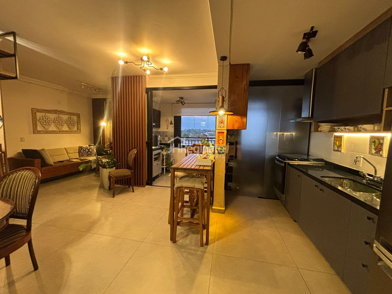 - Sacada equipada com modulados, com tela de proteção e fechamento em vidros 100% retráteis, torneira água quente/fria;